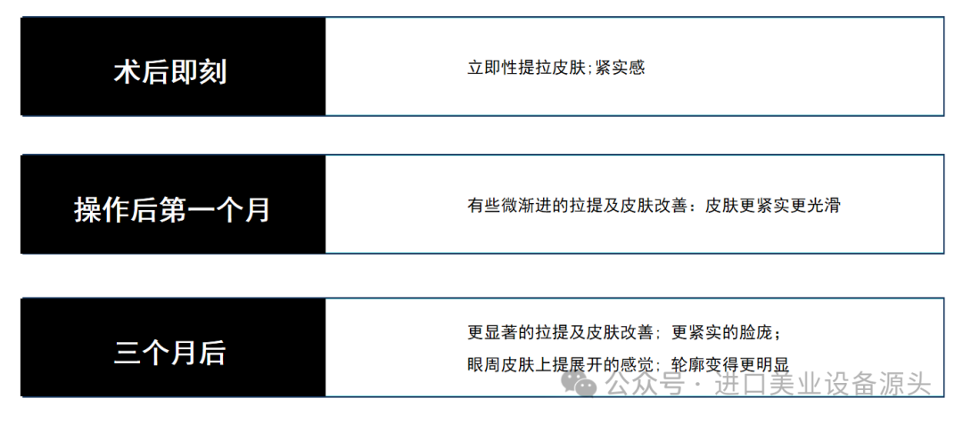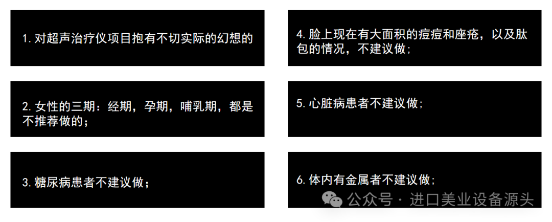 禁忌人群:术后效果:常见问题:A.操作疼痛度如何?取决于不同的客户痛感敏感度和脸部不同部位,操作过程中一般能感觉到温暖和轻微的疼痛, 离骨头较近的部位痛感稍强。B.操作需要多长时间?根据操作方案有所不同,一般操作40~90分钟。C.超声治疗仪有恢复期吗?做完会红肿、淤青吗?无恢复期,操作后即可恢复到正常生活中。术后偶有轻微泛红,很快即会消退,不影响日常生活。D:超声治疗仪操作后如何护理?避免过热的环境,如桑拿,温泉,阳光下暴晒。注意补水保湿。E:什么时候可以看到操作后的效果?术后即刻就能见到提升效果.3个月之后,效果达到峰值。F:操作多久见效?只要操作一次,就会有很好的效果。如果希望有更好的长期效果,建议按疗程操作。