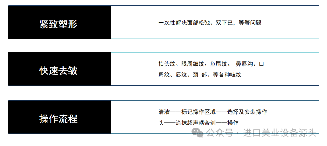 仪器原理:超声治疗仪是一款能快速紧致皮肤,改善皮肤衰老导致的松、垂、皱纹等皮肤问题的抗衰设备。它采用微点聚焦的方式,将超声波能量聚焦在皮下SMAS筋膜层、真皮层、 脂肪组织,并且形成微细热凝固点TCP,起到提拉紧致的作用,达到筋膜悬吊拉皮的效果,再由深至浅改善皮肤皮下结构,令老化的胶原蛋白收缩,并刺激胶原蛋白增生和重组,使皮肤恢复弹性。仪器介绍:1.超声深层抗衰是利用高强度聚焦式超声波,作用于皮下深层,超声的穿透深度和   精准度较高。2.不伤害皮肤表面的同时作用于肌肤真皮层、筋膜层,刺激胶原蛋白的增生与重组,可以起到收紧轮廓,除皱紧肤的作用。3.非侵入式、安全、快速、舒适、有效。4.全层抗衰,smas筋膜层、皮下脂肪、真皮层全覆盖,全面应对肌肤衰老问题。