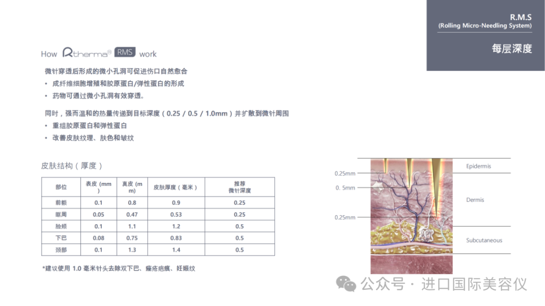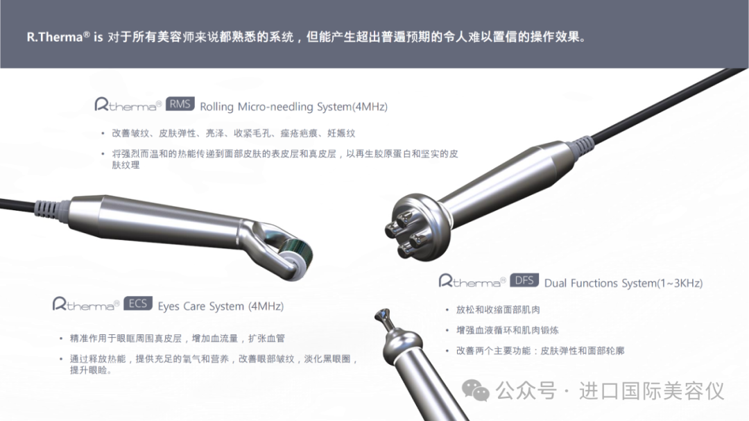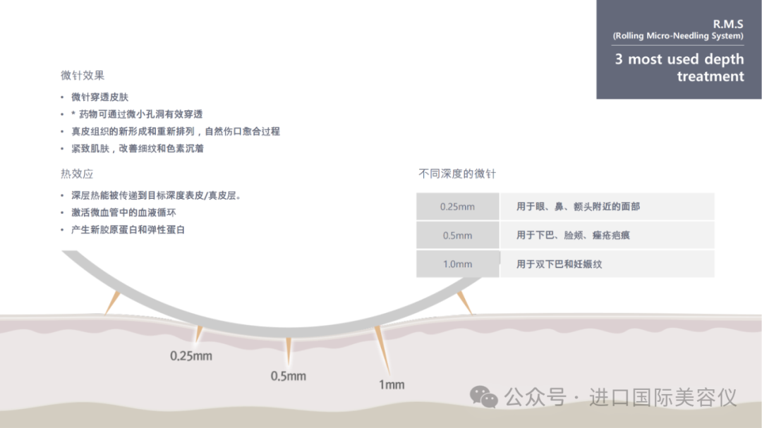 全球首創專利技術 市場唯3款探頭 4 大功效助你打造三大層面 層層撐起肌膚Rtherma® 滚針射频全球首創專利技術 市場唯一由表皮 真皮 直達肌肉層面真正實現>一部一到位