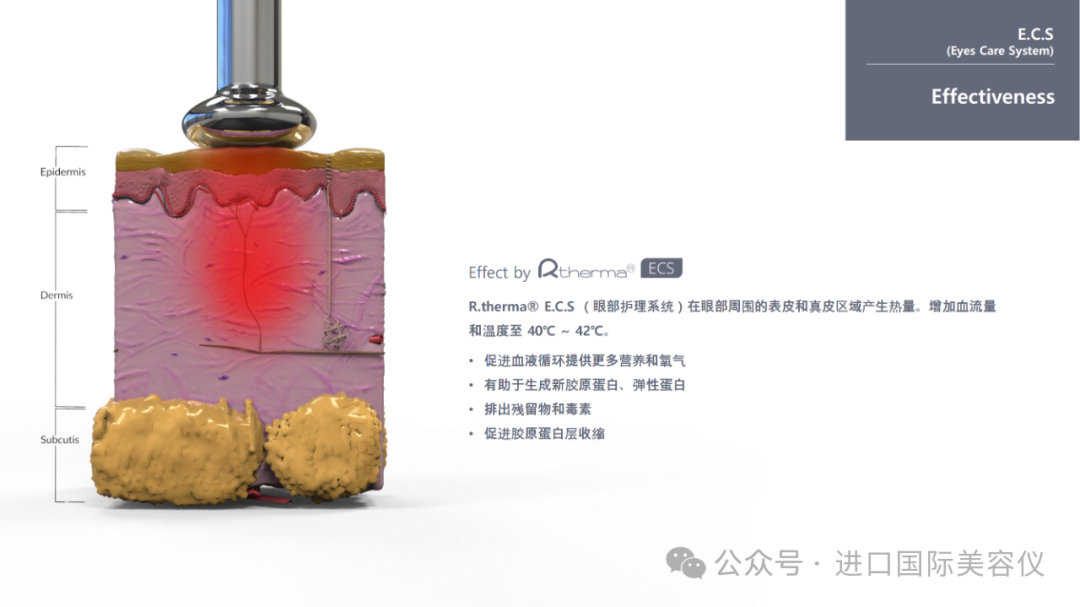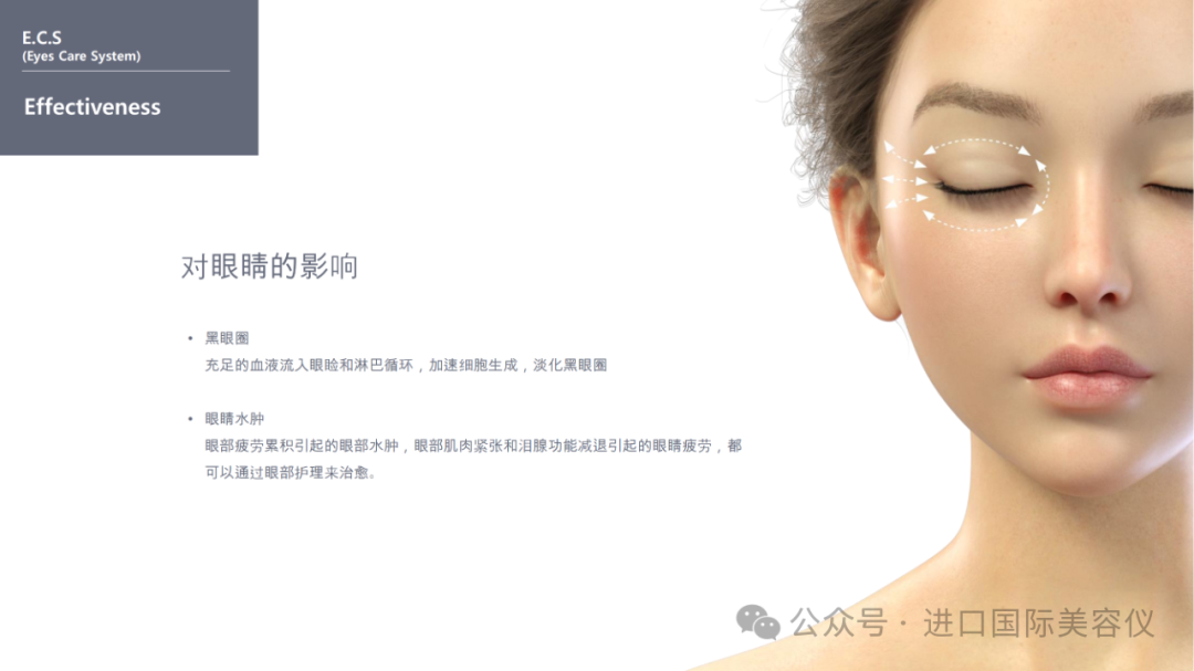 專為眼部肌膚而設通過熱能增加眼部四周的血液和淋巴循環,提高供氧量及新陳代谢率,令眼睛更明亮。
