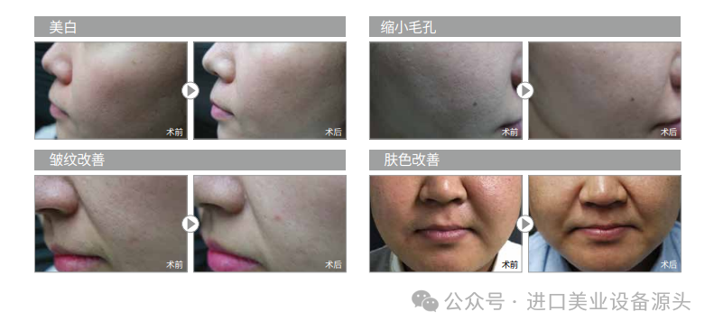 适用人群:毛孔粗大、痘印痘坑、肤色暗沉粗糙、皮肤松弛、有细纹干纹。仪器原理:运用非烫伤技术,利用网状射频能量加热组织,射频能量可直达肌底,激活自身胶原修复系统,促进胶原再生,为肌底建起网状支架,承托起松弛下垂的肌肤,使肌肤恢复紧实、弹性饱满、抚平皱纹、改善色素及细致毛孔等。仪器优势:韩国原装进口、安全性高、能量层面精准,结合了点阵激光的表皮剥脱与射频的真皮再生的双重功效,零结痴或者浅结痴、避免了修复期长以及留色沉等术后并发症,操作手法简单,操作风险小,且易复制,对表皮及真皮问题改善效果明显。效果反馈: